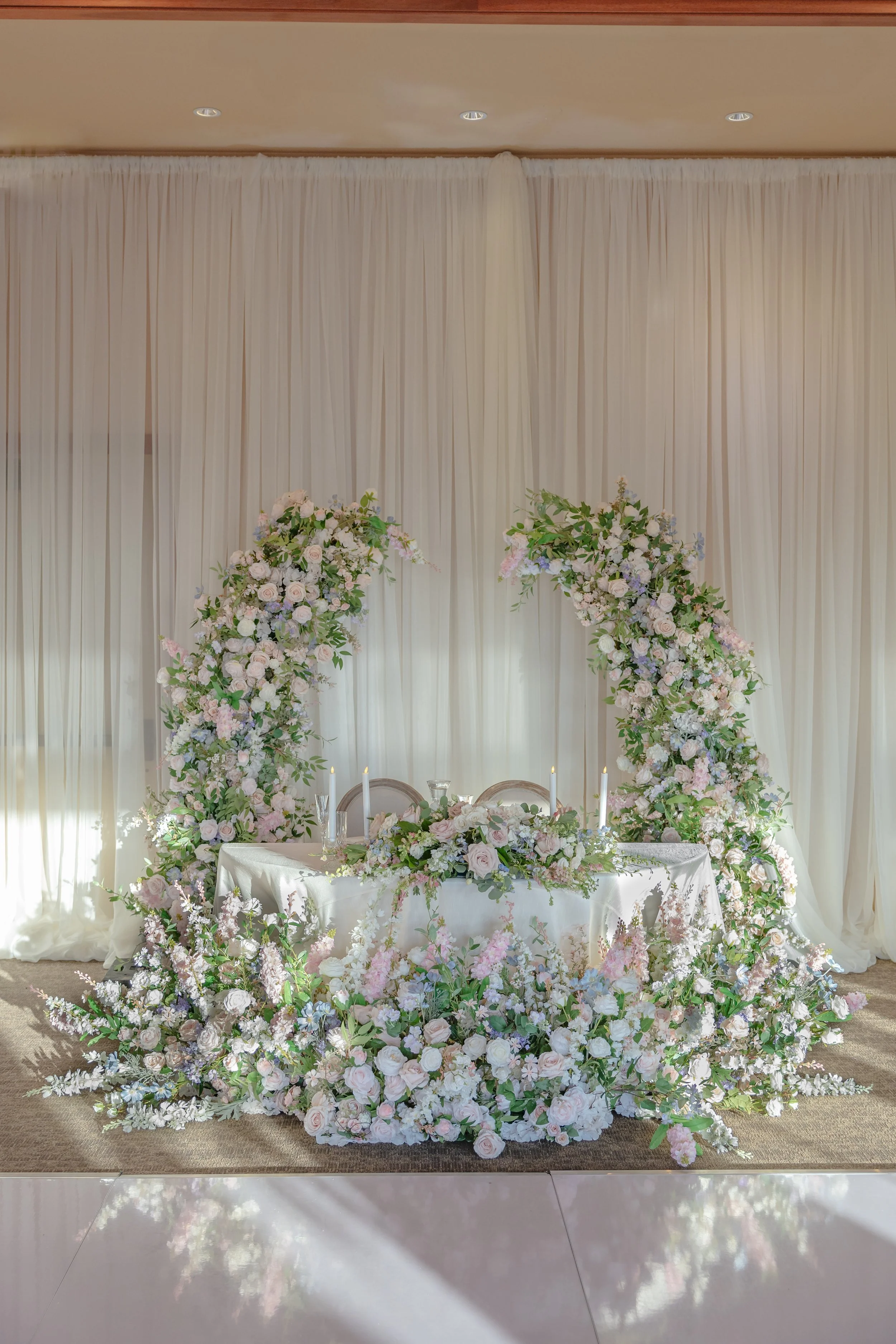 Our Kate Flower Arches features a variety of white, pink, lilac and light blue flowers and greenery and is perfect for your wedding day. It can be used for your ceremony or sweetheart table, or both! Our team can move the arch from your ceremony area to your sweetheart table area for an additional fee.